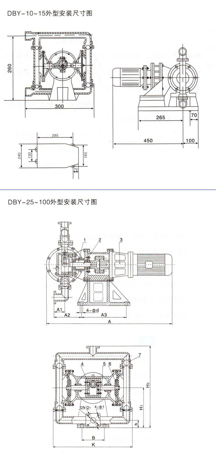三、DBY型電動(dòng)隔膜泵技術(shù)參數(shù): 流量:0-20m3/h; 揚(yáng)程:30m; 功率:0.37-4kw; 轉(zhuǎn)速:1450r/min; 口徑:10-100mm; 溫度:-15-+150℃; 自吸高度:5-7m。