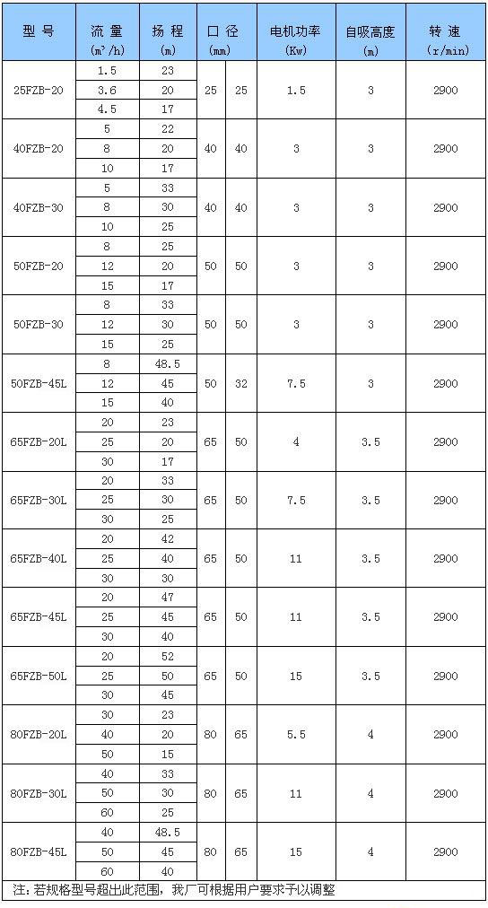 三、FZB型系列氟塑料自吸泵技術參數(shù):