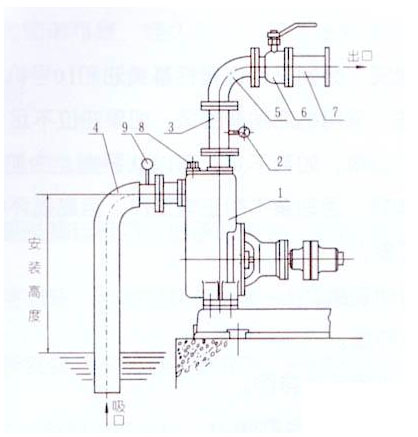 a.吸入口的安裝高度不能超過5米,在條件許可時,吸入口的安裝高度應(yīng)盡可能地低于水池的儲水平面,并盡量縮短吸入管的長度, 少裝彎頭,這樣有利于縮短自吸時間,提高自吸功能。