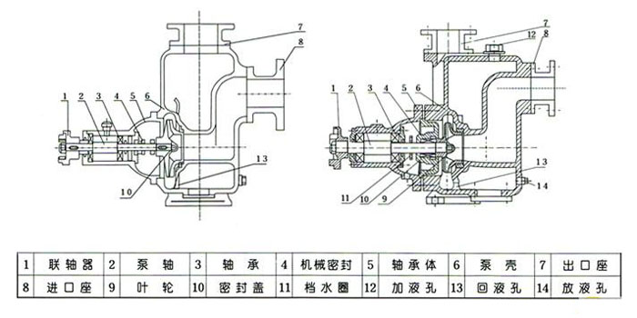 在一些泵的軸承體底部還沒有冷卻室。當(dāng)軸承發(fā)熱引起軸承體溫升超過70℃時,可在冷卻室處通過任意一只冷卻液管接頭,注入冷卻液循環(huán)冷卻。泵內(nèi)部防止液體由高壓區(qū)向低壓區(qū)泄漏的密封機(jī)構(gòu)是前后密封環(huán),前密封環(huán)裝在泵體上,后密封環(huán)裝在軸承體上,當(dāng)泵經(jīng)長期運(yùn)轉(zhuǎn)密封環(huán)磨損到一定程度.并影響到泵的效率和自吸性能時.應(yīng)給予更換。 二、ZX型臥式自吸離心泵(結(jié)構(gòu)圖)